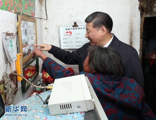 6月21日,中共中央总书记、国家主席、中央军委主席习近平到山西考察调研。这是习近平来到忻州市岢岚县赵家洼村看望贫困村民王三女。新华社记者 庞兴雷摄
